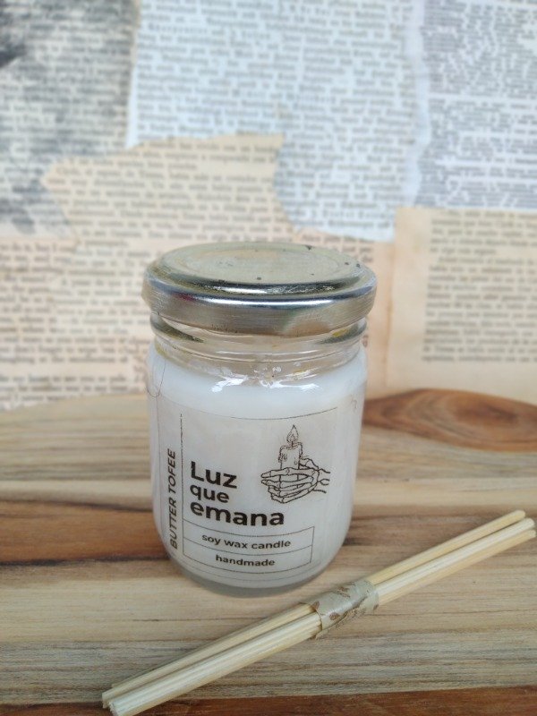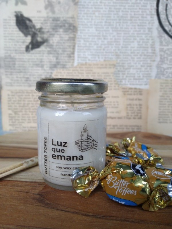 Una velita de cera de soja con un aroma dulce y acaramelado como el Butter Tofee