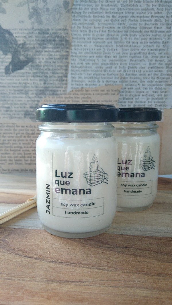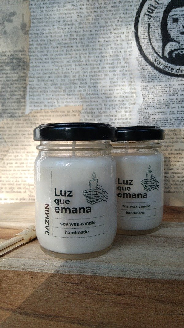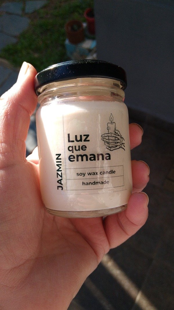 Una velita de cera de soja con el aroma dulce y estacinal del Jazmí